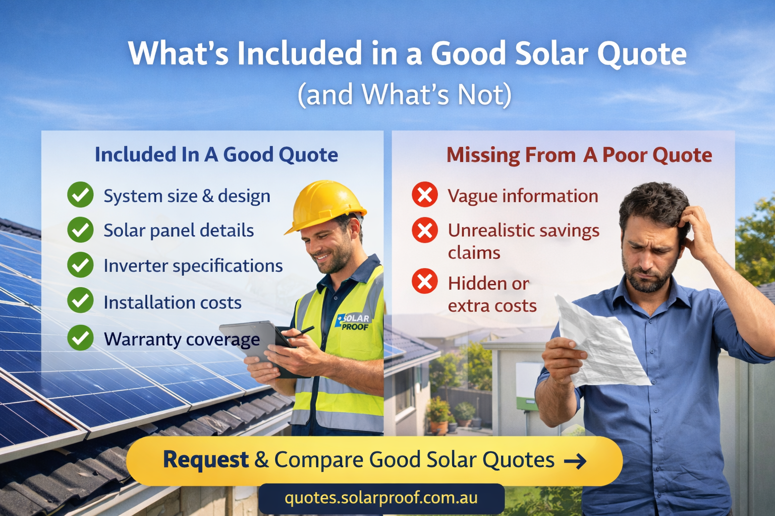 Why Understanding Solar Quotes Matters Choosing solar is a major investment. However, many homeowners accept quotes without fully understanding what they include. As a result, systems may underperform, warranties may be unclear, or hidden costs may appear later. A good solar quote should be transparent, detailed, and tailored to your home. Knowing what to look … Read moreWhat’s Included in a Good Solar Quote (and What’s Not)
